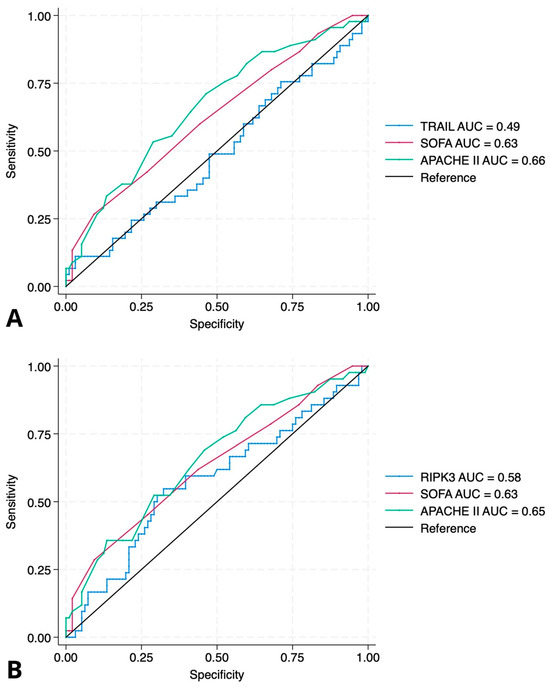ROC curves for prediction of in-hospital mortality. (A) ROC curve for TRAIL compared to SOFA and APACHE II scores. The area under the curve (AUC) for TRAIL was 0.49 (95% CI: −0.011 to 0.015, p = 0.75), indicating no prognostic discrimination. In contrast, SOFA and APACHE II scores had AUCs of 0.63 (OR = 1.25, 95% CI: 1.05–1.50; p = 0.012) and 0.66 (OR = 1.09, 95% CI: 1.03–1.16; p = 0.002), respectively. (B) ROC curve for RIPK3 compared to SOFA and APACHE II scores. The AUC for RIPK3 was 0.58 (95% CI: −0.0006 to 0.0019, p = 0.33), suggesting limited predictive value. SOFA and APACHE II retained better discriminative ability with AUCs of 0.63 and 0.65. Abbreviations: TRAIL—TNF-related apoptosis-inducing ligand; RIPK3—receptor-interacting protein kinase-3.