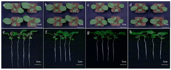 Seedlings performance of B. carinata exposed to different concentrations of CdCl2 solutions. (a–d) The performance of shoots of B. carinata plants treated with 0 mmol/L (CK), 0.25 mmol/L, 0.5 mmol/L, and 1 mmol/L CdCl2 solutions for 7 days. (e–h) The performance of young seedlings treated with 0 mmol/L (CK), 0.25 mmol/L, 0.5 mmol/L, and 1 mmol/L CdCl2 solutions for 7 days.