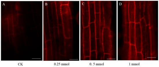 The changes in root microstructure after 7 days of different concentrations of Cd treatment. Bar = 50 μm. (A–D) The microstructure of B. carinata root tips in control group (A) and under different concentrations of Cd treatment (B–D) after PI staining.