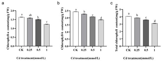 Chlorophyll content changes in B. carinata seedlings under different concentrations of Cd treatment. (a) Chlorophyll a content. (b) Chlorophyll b content. (c) Total chlorophyll content. Different letters represent statistically different groups determined by the LSD method (p < 0.05). The error bar in chart indicates the SE, and three replicates (n = 3) per sample were prepared.