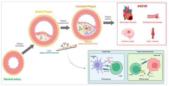 Immune checkpoint inhibitor (ICI)-induced atherosclerosis development. Cytokine dysregulation and epitope sharing promote the transition from a “cold” to an “inflamed” plaque microenvironment, with infiltration of CD4+ T cells and macrophages (and occasional CD8+ T cells in advanced lesions). This inflammatory state accelerates plaque progression, necrotic core formation, and rupture risk. The checkpoint blockade box illustrates how inhibition of CTLA-4, PD-1/PD-L1, and LAG-3 pathways removes protective signals against vascular inflammation. ASCVD = atherosclerotic cardiovascular disease, including myocardial infarction, ischemic stroke, peripheral artery disease, and aortic disease.