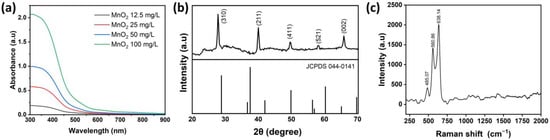 Overview of MnO2 NPs characterization: (a) UV-Vis absorption results, (b) XRD analysis, and (c) Raman spectra.