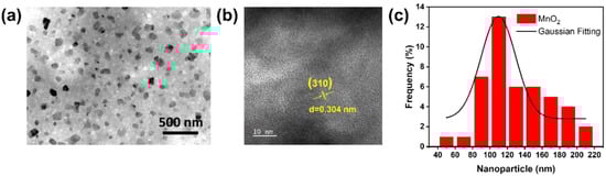 TEM imaging was used for further characterization to examine the topography and average particle size distribution of MnO2 NPs. Based on Figure 2a, MnO2 NPs had an approximate size of 100 nm. In addition, HR-TEM was conducted to validate the dimensions and morphology of MnO2 NPs. As depicted in Figure 2b, lattice fringe patterns of MnO2 NPs exhibited a d-spacing of 0.304 nm, aligning with the (310) plane of MnO2 NPs as referenced (JCPDS No. 044-0141). The average size was further validated using a Gaussian fitting curve simulation. This was evidenced by the histogram graph depicting the size distribution of MnO2 NPs based on 45 NPs present in the TEM image in Figure 2a. As shown by the Gaussian fitting curve in Figure 2c, the average particle size of MnO2 NPs was approximately 109.7 ± 5.6 nm. Previous studies have confirmed that MnO2 nanoparticles exhibit excellent stability in deionized (DI) water, showing no aggregation [50] and no significant changes in particle size or zeta potential [51].