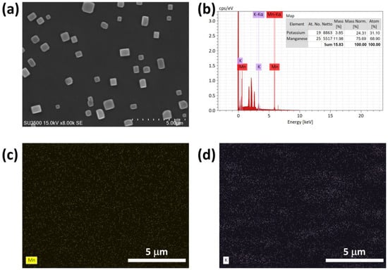 To understand surface properties and morphology of MnO2 NPs using SEM as depicted in Figure 3a, the crystal structure of MnO2 NPs appeared as cube-like particles with a smooth surface. Further analysis of SEM images was conducted to identify the EDX elemental distribution of MnO2 NPs. As illustrated in Figure 3b, MnO2 NPs consisted of potassium (K) at 24.31% and manganese (Mn) at 75.69%. The elemental distribution map of MnO2 NPs is also depicted in Figure 3c.