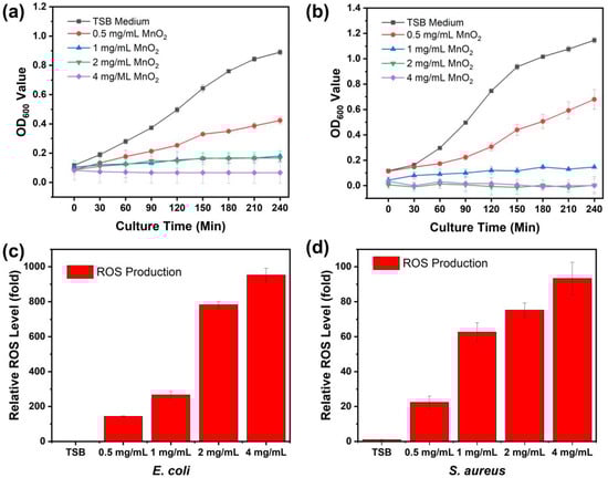 A bacterial growth curve analysis was conducted to assess impacts of various concentrations MnO2 NPs on the growth of Gram-negative bacteria (E. coli) and Gram-positive bacteria (S. aureus). Both E. coli and S. aureus were activated and then were incubated at 37 °C. OD values of the bacterial solutions were monitored every 30 min for 240 min. The minimum inhibitory concentration of MnO2 NPs was obtained through the growth curves assay. From Figure 4a,b, the MIC values of MnO2 NPs against E. coli and S. aureus was determined to be 1 mg/mL, at which no bacterial growth occurred. As shown by the bacterial growth presented in Figure 4a,b, OD600 values of both E. coli and S. aureus decreased as the concentration of MnO2 NPs increased. OD600 values for the controls of these two groups represented by E. coli and S. aureus in TSB solution medium with no treatment were ~0.89 and ~1.147, respectively, after incubation for 240 min. Furthermore, OD600 values for E. coli treated with concentrations of 0.5, 1, 2, and 4 mg/mL of MnO2 NPs were 0.4, 0.18, 0.17, and 0.067, respectively. OD600 values for S. aureus treated with same concentrations were 0.68, 0.147, 0.003, and 0, respectively. Respective ROS levels of E. coli treated with serial concentration 0.5, 1, 2, and 4 mg/mL of MnO2 NPs were 143.31-, 266.21-, 782.39-, and 952.64-fold (Figure 4c). ROS levels of S. aureus at the same concentrations of treated MnO2 NPs were 22.42-, 62.66-, 75.13-, and 93.29-fold (Figure 4d), respectively.