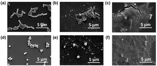 Scanning electron microscopy (SEM) micrograph of E. coli (top columns) and S. aureus (bottom columns), without treatment (a,d) and treated with 2 mg/mL (b,e) and 4 mg/mL MnO2 NPs (c,f).