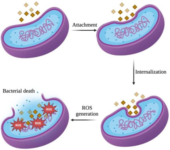 Bacteria possess cell membranes and plasma membranes that function as barriers, separating the bacteria from the external environment and preventing nearly all potential damage that may occur to the cell. Although Gram-positive and Gram-negative bacteria exhibit differences in their cell membrane structure, thickness, and composition, their primary role in self-defense is consistent. The interaction between metal oxide NPs and bacteria induces alterations in the bacterial cell surface, which initiates the antibacterial activity of these NPs. This study demonstrated that the NPs concentration affected their antibacterial activity, consistent with findings of a study by Ogunyemi et al. [38] on the concentration-dependent antibacterial activity of NPs. Furthermore, the nanoscale structure of NPs (1–100 nm) confers a distinct advantage to their antibacterial mechanism, facilitating their attachment and internalization process into the micron-sized bacteria, and causing cellular morphological damage and distortions which cause the death of bacterial cells (Figure 6) [52,53,54,55].