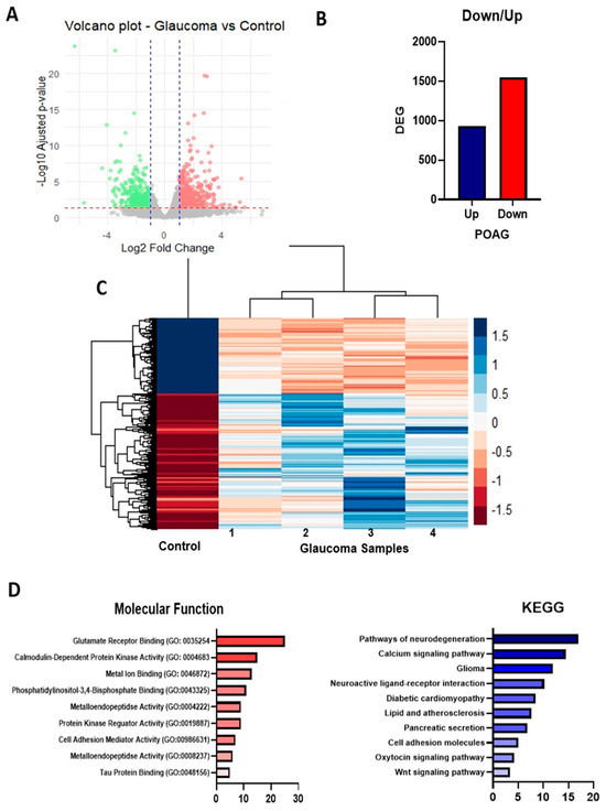 Differential gene expression analysis in POAG patient’s vs. control sample. The figure presents the identification of DEGs, (A) Volcano plot of DEGs in glaucoma patients and control. (B) Barr plot shows the total number of upregulated (blue) and downregulated (red) genes in glaucoma compared to control. (C) Hierarchical Heatmap. (D) Functional enrichment analysis of DEGs. Left panel (GO Molecular function) and right panel (KEEG pathway).