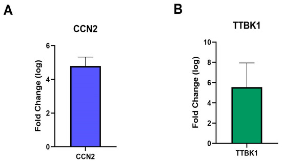Validation of RNA sequencing data was performed using the two upregulated genes showing in conjunctival epithelial cells from POAG patients. The findings demonstrated that the RNA levels of these genes, obtained through RT-qPCR, aligned with the RNA-seq results (Figure 1A). The expression changes in the two upregulated genes, including CCN2/CTGF and TTBK1, are summarized in Table 6 and illustrated in Figure 2.