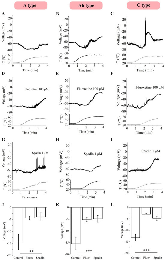 Effects of increasing temperature on the RMP of mNG neurons in the presence and in the absence of fluoxetine and spadin. Increasing temperatures from 24 °C to 50 °C induced a hyperpolarization of the membrane potential in A- (n = 7), Ah- (n = 10) and C-type (n = 8) neurons (A–C) at 37 °C. Heat-induced hyperpolarization is inhibited by 100 µM of fluoxetine (D–F) and 1 µM spadin (G–I) in A, Ah, and C neurons ((J–L), One-way ANOVA, ** p < 0.01; *** p < 0.001). T = Temperature.
