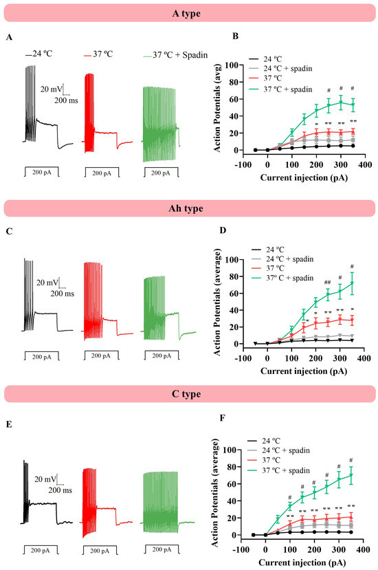 Physiological temperature generated changes in cell excitability. (A) Current increment injections from −50 to 350 (I50, 1 s each) were applied when the temperature was increased from 24 °C to 37 °C in the absence and presence of 1 µM spadin. (B) A type neurons (n = 10)) presented a higher firing rate at physiological values, which significantly increased when the TREK1 channel was blocked by 1 µM spadin (two-way ANOVA with multiple comparisons). (C,D) After applying the same protocol in Ah neurons and (E,F) C type neurons, the increase in number of action potencials was observed, with no differences between neuronal types. An asterisk (*) indicates a statistically significant difference in AP number between 24 °C and 37 °C. A hashtag (#) indicates a statistically significant difference in the number of APs at 37 °C compared to 37 °C in the presence of 1 µM spadin. # p < 0.05, ## p < 0.01, * p < 0.05 and ** p < 0.01.
