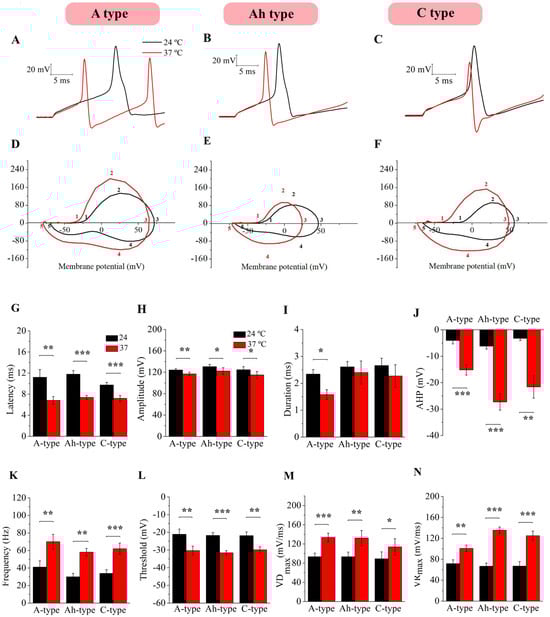 Changes in individual action potential parameters in response to temperature. Individual AP parameters were measured at 24 and 37 °C for each subtype (A–C) and AP phase plots were constructed for A (D), Ah (E), and C neurons (F) at 24 °C (black trace) and 37 °C (red trace) to study changes in velocity. As observed in the representative traces of the three neuronal types, latency (G) and amplitude (H) significantly decreased, duration (I) changed only in A-type neurons, and AHP (J) and frequency (K) were significantly augmented in A (n = 10), Ah (n = 10), and C neurons (n = 10) when the temperature was increased at 37 °C (paired, t-test, * p < 0.05, ** p < 0.01 and *** p < 0.001). The threshold (L), maximal velocity of depolarization (VDmax, (M)), and maximal velocity of repolarization (VRmax, (N)) showed different results at 37 °C compared to room temperature in all three neural types (paired, t-test, * p < 0.05, ** p < 0.01 and *** p < 0.001).