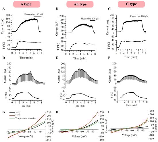 To ensure the involvement of TREK channels in the heat-induced current, the same experiments were repeated in the presence of cocktail B, which blocks the same channels as cocktail A plus several TRPs and Ca+2-activated K+ channels (see the Section 4). Upon increasing the temperature, an outward current and a fall in membrane resistance were clearly observed at −30 mV in all three neuronal types. The change in the conductance from room to physiological temperature was statistically significant in A-, Ah-, and C-type neurons (paired t-test, p < 0.001). Predictably, heat-induced currents were inhibited by 100 µM of fluoxetine in 10 A-type, 16 Ah-type, and 9 C-type neurons (Figure 5A–C). The current elicited by voltage ramps at 24 °C was subtracted from that at 37 °C to isolate the temperature-activated component. Voltage ramps were performed in three A-, five Ah-, and five C-type neurons (Figure 5D–F) to identify I-V relationships, and temperature-dependent currents exhibited similar reversal potentials in the three neuronal subtypes. The results were consistent with those obtained using cocktail A and are summarized in Table 4.
