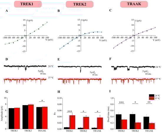 TREK subfamily single-channel properties. Under symmetrical K+ concentrations and using cell-attached configuration, current–voltage relationships were constructed, and a total of 11 TREK-1 (A), 3 TREK2 (B) and 5 TRAAK channels (C) were identified. Single-channel recordings at −60 mV revealed increases in activity at 37 °C for TREK-1 (D), TREK-2 (E), and TRAAK (F). The single-channel current amplitude (G), Po (H), and dwell time (I) were significantly different at room (24 °C) and physiological (37 °C) temperatures (paired t-test, * p < 0.01, ** p < 0.01 and *** p < 0.001).