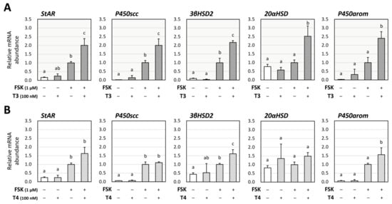 To evaluate the effects of thyroid hormones (T3 and T4) on steroid production by GCs, their impact on the expression of key steroidogenic enzymes were examined using human KGN cells. As KGN cells have been reported to have low levels of FSH receptors [], FSK was used to evaluate steroidogenesis. Real-time quantitative PCR (RT-qPCR) was performed to access the relative mRNA abundance of steroidogenic enzymes, steroidogenic acute regulatory protein (StAR), steroid side-chain cleavage enzyme (P450scc), 3β-hydroxysteroid dehydrogenase 2 (3βHSD2), 20α-hydroxysteroid dehydrogenase (20αHSD), and aromatase (P450arom) in KGN cells. As shown in Figure 1, in the absence of FSK (1 μM), treatment with T3 (100 nM) or T4 (100 nM) alone did not change the mRNA levels of the enzymes. Of note, treatment with T3 significantly increased FSK-induced mRNA levels of StAR, P450scc, 3βHSD2, 20αHSD, and P450arom (Figure 1A). On the contrary, as shown in Figure 1B, treatment with T4 for 24 h increased FSK-induced mRNA levels of 3βHSD2 and P450arom, but not that of StAR, P450scc, and 20αHSD.