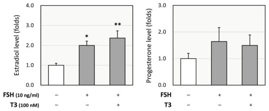 Effects of T3 on steroidogenesis by rat granulosa cells (GCs). Rat primary GCs were treated with FSH (10 ng/mL) with or without T3 (100 nM) for 48 h. The conditioned media were collected, and the concentrations of estradiol and progesterone were quantified using ELISA and expressed as fold changes. Results are shown as means ± SEM and were statistically analyzed using ANOVA followed by Tukey’s post hoc test; *, p < 0.05; **, p < 0.01 between the indicated groups.