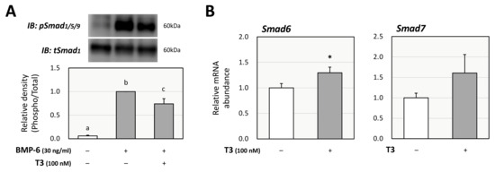 Effects of T3 on Smad signaling induced by BMP-6 in KGN cells. (A) KGN cells were pretreated with T3 (100 nM) for 24 h and then stimulated with BMP-6 (30 ng/mL) for 1 h. The cell lysates were analyzed by SDS-PAGE/immunoblotting using antibodies against pSmad1/5/9 and tSmad1. The signal intensities of pSmad1/5/9 were normalized to those of tSmad1. The provided data are representative of at least three independent experiments and are expressed as fold changes. (B) KGN cells were treated with T3 (100 nM) for 24 h. Total RNAs were extracted, and the mRNA levels of inhibitory Smads (Smad6 and Smad7) were standardized by RPL19 mRNA levels and expressed as fold changes. Results are shown as means ± SEM and were statistically analyzed using ANOVA followed by Tukey’s post hoc test (A) or the unpaired t-test (B). Values with different superscript letters are significantly different at p < 0.05 (A); *, p < 0.05 vs. control groups (B).