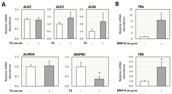 Interactions between T3 and BMP signaling in KGN cells. (A) KGN cells were treated with T3 (100 nM) for 24 h. Total cellular RNAs were extracted, and subsequently the mRNA levels of BMP receptors (ALK-2, -3, -6, ActRIIA, and BMPRII) were standardized by RPL19 mRNA levels and expressed as fold changes. (B) KGN cells were treated with BMP-6 (30 ng/mL) for 24 h. Total cellular RNAs were extracted, and the mRNA levels of thyroid hormone receptors (TRα and TRβ) were standardized by RPL19 mRNA levels and expressed as fold changes. Results are shown as means ± SEM and were statistically analyzed using the unpaired t-test; *, p < 0.05 vs. control groups.