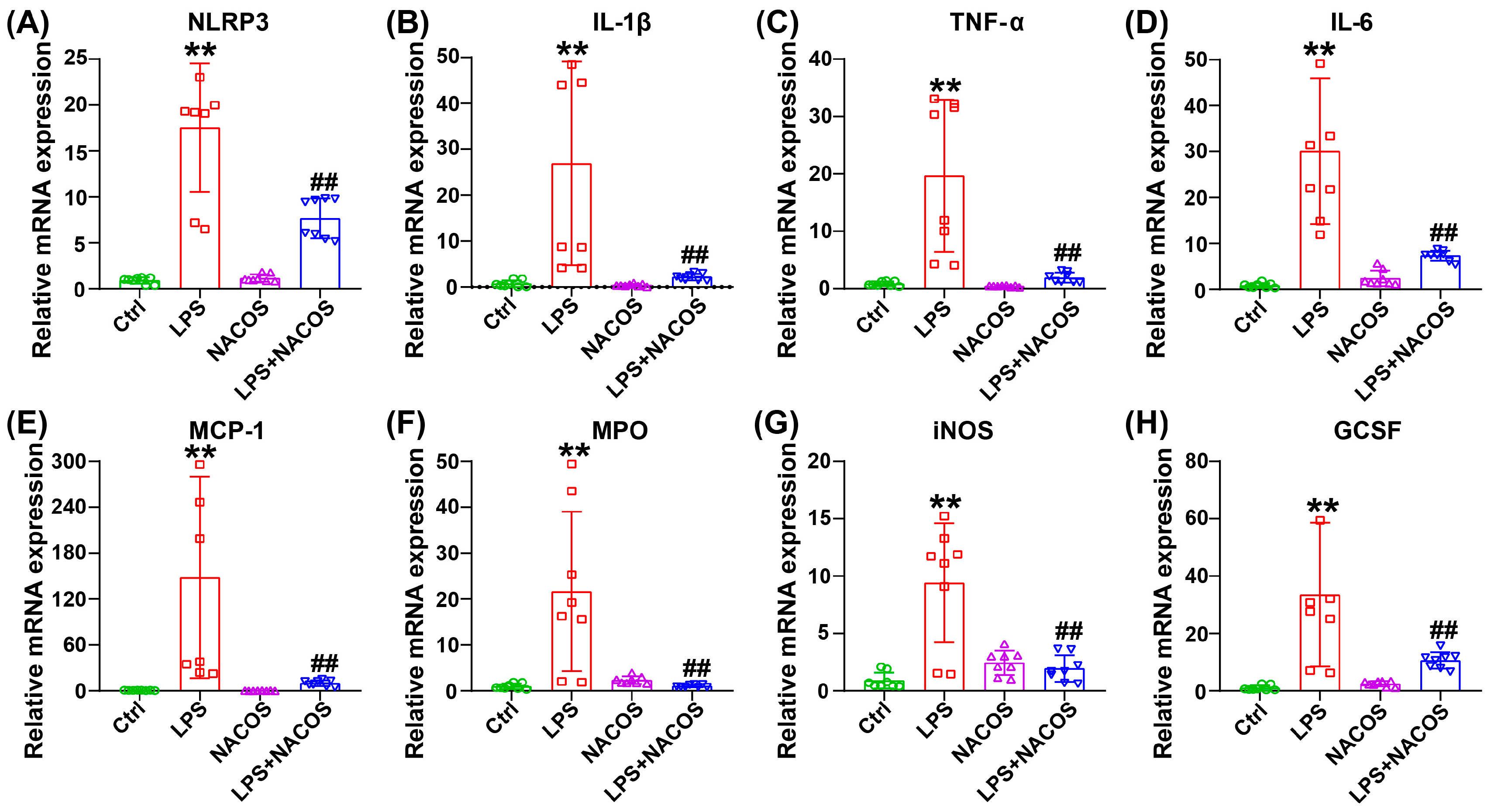 2.2. Effect of NACOS Treatment on Inflammatory Responses in Lung Tissues of ALI Mice