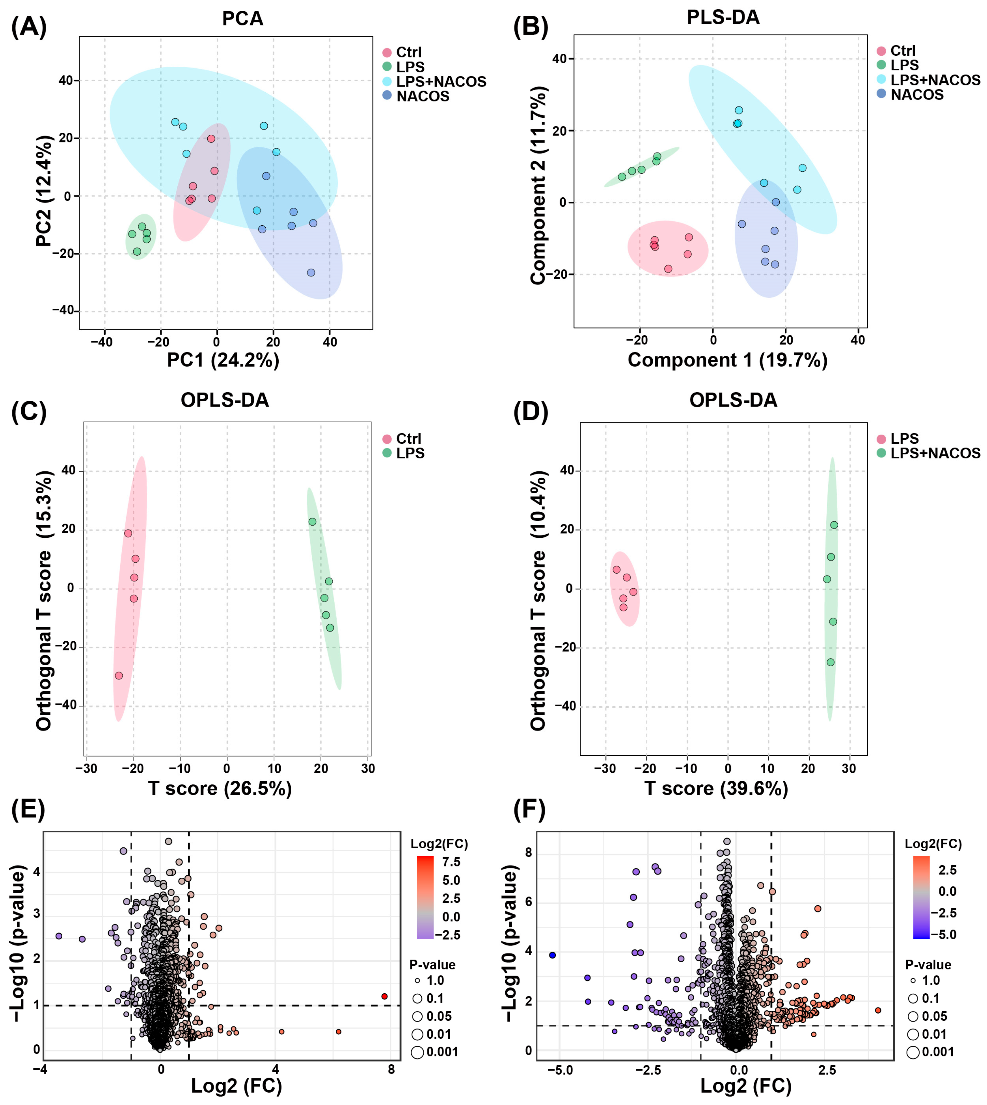 - Cheng, X.; Cao, L.; Sun, X.; Zhou, S.; Zhu, T.; Zheng, J.; Liu, S.; Liu, H. Metabolomic profile of plasma approach to investigate the mechanism of Poria cocos oligosaccharides attenuated LPS-induced acute lung injury in mice. J. Pharm. Biomed. Anal. 2024, 247, 116262. [Google Scholar] [CrossRef]