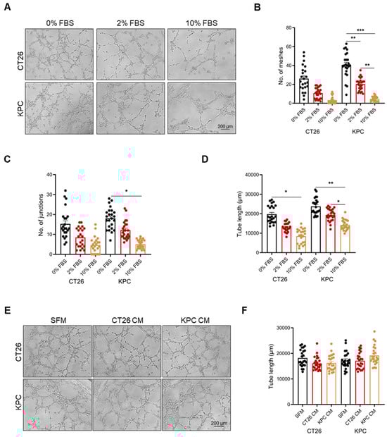 VM formation in CT26 and KPC cells was assessed by their capacity to form vascular networks when cultured on Matrigel in vitro. Our results showed that CT26 and KPC cells were able to form tube-like structures (Figure 1A). Intriguingly, just like in endothelial- cell-driven angiogenesis, VM formation in both cell lines was dependent on serum deprivation, as demonstrated by the decreased tube length, as well as the reduced number of meshes and junctions, with increasing concentrations of FBS (Figure 1B–D).