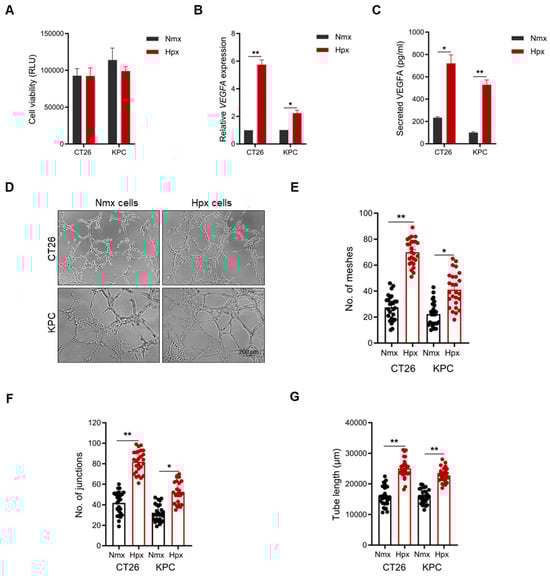 Effect of hypoxia on vascular mimicry formation. (A) Cell viability of CT26 and KPC cells cultured under normoxic or hypoxic conditions for 24 h. (B) mRNA gene expression of VEGFA and (C) secreted VEGFA protein levels in CT26 and KPC cells after culture in normoxic or hypoxic conditions for 24 h. (D) Images of normoxia- and hypoxia-educated CT26 and KPC cells undergoing VM formation. Quantification of the number of (E) meshes and (F) junctions and (G) tube length in normoxia- and hypoxia-educated CT26 and KPC cells undergoing VM (n = 8 images per independent biological experiment). All data are expressed as mean ± SEM of three independent biological experiments, and statistical significance is determined using unpaired two-tailed t-test with Welch’s correction: * p < 0.05 and ** p < 0.01.