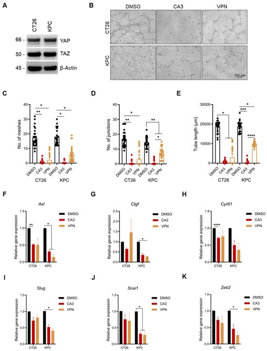 The Hippo pathway has been previously implicated in VM formation in many solid tumors, including melanoma, glioblastoma, lung, colorectal, and pancreatic cancers [,,]. As our cell models, CT26 and KPC, undergo VM, we confirmed the expression of YAP and TAZ, the functional effectors of the Hippo pathway, via Western blotting (Figure 3A). Next, we investigated whether the pharmacological inhibition of YAP, using two known inhibitors, CA3 and Verteporfin, affected VM formation in these cell lines. We investigated a drug concentration that does not induce cytotoxicity in these cells, such that any differences observed in VM formation are not due to cytotoxicity. As VM formation was analyzed 6 h post-culture, we assessed the viability of CT26 and KPC cells in the presence of either inhibitor. Our results showed that at 500 nM of either inhibitor, there were no differences in cell viability compared to our control treatment (Supplementary Figure S2A), corroborating findings from our previous study []. We then evaluated the effect of these inhibitors on VM formation. In both cell lines, there was a significant decrease in VM formation in the treated groups, as demonstrated by the reduced number of meshes and junctions and reduced tube length (Figure 3B–E). Interestingly, CA3 had a more substantial inhibitory effect on KPC cells than Verteporfin. We concluded that the differences observed between our control and treatment groups are solely linked to YAP inhibition and not a consequence of cell cytotoxicity. To gain a deeper understanding of how the two inhibitors affect VM formation, we examined the gene expression levels of known YAP/TAZ target genes. We relied on our previous findings, where we demonstrated that YAP inhibition by either drug led to cell-dependent decreased expression in multiple YAP/TAZ gene targets after 6 h []. At 6 h, there were no changes in the expression of the YAP/TAZ gene targets. However, we observed a decrease in select YAP/TAZ target genes in both cell lines after 24 h (Figure 3F–K, Supplementary Figure S2B).