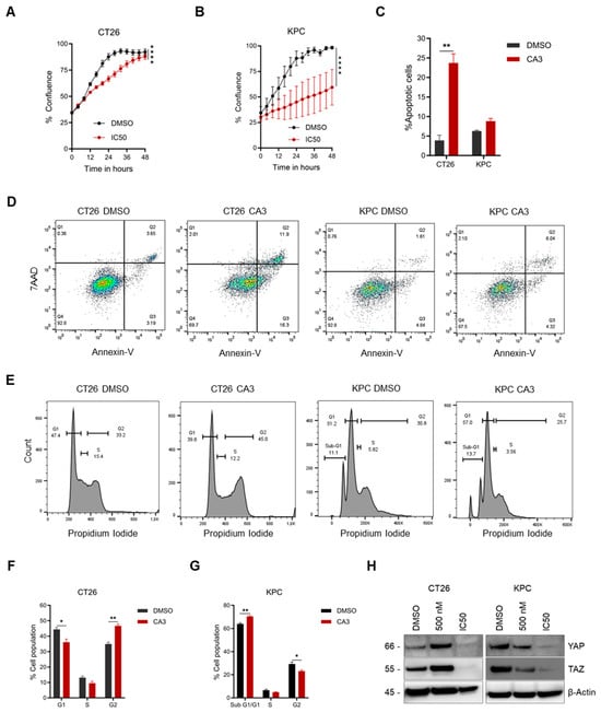 Given our findings using the VM-inhibiting dose of either drug, we were curious to determine whether the IC50 concentrations of either drug would inhibit additional functional processes such as proliferation and invasion. To this end, the IC50 of either drug was evaluated using the Cell Titer GloTM Cell Viability Assay. As the IC50 for Verteporfin was too high (>10 µM), CA3 was used for subsequent functional assays, as its IC50 values fell within the clinically relevant range (Supplementary Figure S2I,J). First, the effect of CA3 on cell proliferation was investigated using the IncuCyte XTM Live Cell Imager. Our results showed that CA3 (IC50 value) significantly inhibited proliferation in both cell lines (Figure 4A,B). We hypothesized that the observed CA3-mediated decrease in cell proliferation may be due to the induction of apoptosis or changes in cell cycle progression, as previously reported [,]. Treatment of either cell line with its respective CA3 IC50 concentration led to a cell-dependent apoptotic effect. While CT26 cells were sensitive to CA3, which significantly increased apoptosis compared to the control, KPC cells were insensitive to CA3 treatment (Figure 4C,D). Additionally, we also observed the cell-dependent effects of CA3 on cell cycle progression. While treating CT26 cells with CA3 led to an increase in cells in the G2 phase, in KPC cells, there was a marked increase in cells in the sub-G1/G1 phase post-treatment with CA3 (Figure 4E–G). These observations could be partly associated with the loss of YAP/TAZ protein expression following treatment with CA3 at an IC50 concentration (Figure 4H).
