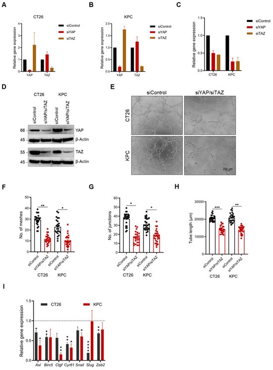 Pharmacological inhibition of YAP/TAZ-mediated VM formation was corroborated by YAP/TAZ knockdown. Initially, YAP and TAZ gene expression post-transfection was evaluated by qPCR (Figure 5A,B). However, assessment of VM formation using either siYAP or siTAZ did not yield significant differences in KPC cells. Interestingly, in CT26 cells, while siTAZ did not have an effect on VM formation, siYAP led to a decrease in the number of junctions and tube length (Supplementary Figure S3A–D). Given these mixed findings, dual knockdown cells were generated, and the expression of their respective genes was evaluated by qPCR and immunoblotting (Figure 5C,D). VM formation was significantly attenuated in dual knockdown cells compared to the control group, as indicated by the number of meshes and junctions and tube lengths (Figure 5E–H). Analysis of known YAP/TAZ transcriptional gene targets by qPCR revealed a cell-dependent loss of expression of several genes, with Axl and Cyr61 significantly downregulated in both cell lines (Figure 5I). Given these findings, we asked whether the expression of YAP/TAZ correlated with the expression of these transcriptional targets in human PDAC and CRC tumors using the Gene Expression Profiling Interactive Analysis (GEPIA) tool []. We found a positive correlation between YAP/TAZ expression and their transcription targets in both CRC and PDAC tumors (Supplementary Figure S3E,F).