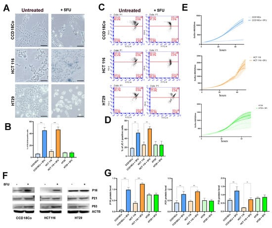 Senescence was first assessed by SA-β-galactosidase staining (Figure 1A,B). In untreated CCDs, SA-β-gal positivity was ~16–18%, which increased to ~30–33% after 5FU exposure. A similar increase was observed in HCT116 cells. HT29 cells with mutant P53 and increased resistance to senescence exhibited minimal changes in SA-β-gal activity.