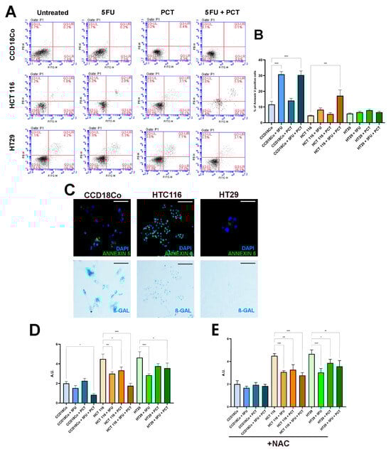 To evaluate senolytic activity, cells were treated with PCT (20 µM for 48 h) following 5FU exposure. Annexin V staining revealed a significant increase in early apoptosis in CCD and HCT116 cells that had been rendered senescent by 5FU, compared to untreated or 5FU-only controls (Figure 2A,B). Immunocytochemical co-staining with SA-β -galactosidase confirmed that apoptotic cells were predominantly senescent, indicating that PCT selectively targets the senescent population for elimination (Figure 2C).
