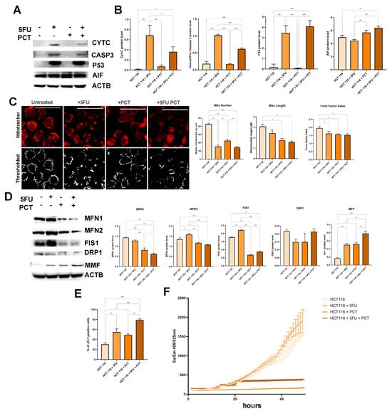 To better understand these changes, we examined proteins regulating mitochondrial dynamics. Western blot analysis demonstrated that PCT reduced MFN1 and MFN2, while DRP1 remained unchanged, and FIS1 decreased (Figure 3D). Notably, the DRP1 adaptor MFF was upregulated by 5FU and strongly increased in the 5FU + PCT condition. These results indicate that PCT does not act by elevating DRP1 abundance but instead shifts the balance of mitochondrial dynamics by suppressing fusion (↓ MFN1/2) and enhancing fission competence via MFF upregulation, thereby promoting mitochondrial fragmentation.