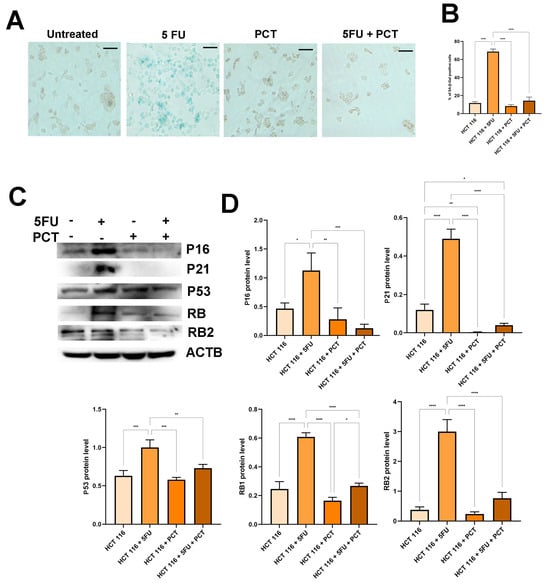 Long-term reduction in senescence markers after PCT treatment. (A) Representative SA-β-galactosidase staining images taken 7 days after PCT treatment of HCT116 cells. Images were acquired at 40× magnification; the dark bar in each panel represents the scale bar (100 μm). (B) Quantification of SA-β-gal positive cells demonstrates a significant reduction in senescence after PCT compared to the 5FU only group (n = 3, ±SD; **** p < 0.0001). (C) Western blot showing P16, P21, P53, RB, and RB2 expression at day 7. (D) Densitometric analysis confirms decreased expression of all tested senescence markers following PCT (n = 3, ±SD; * p < 0.05, ** p < 0.01, *** p < 0.001, **** p < 0.0001).
