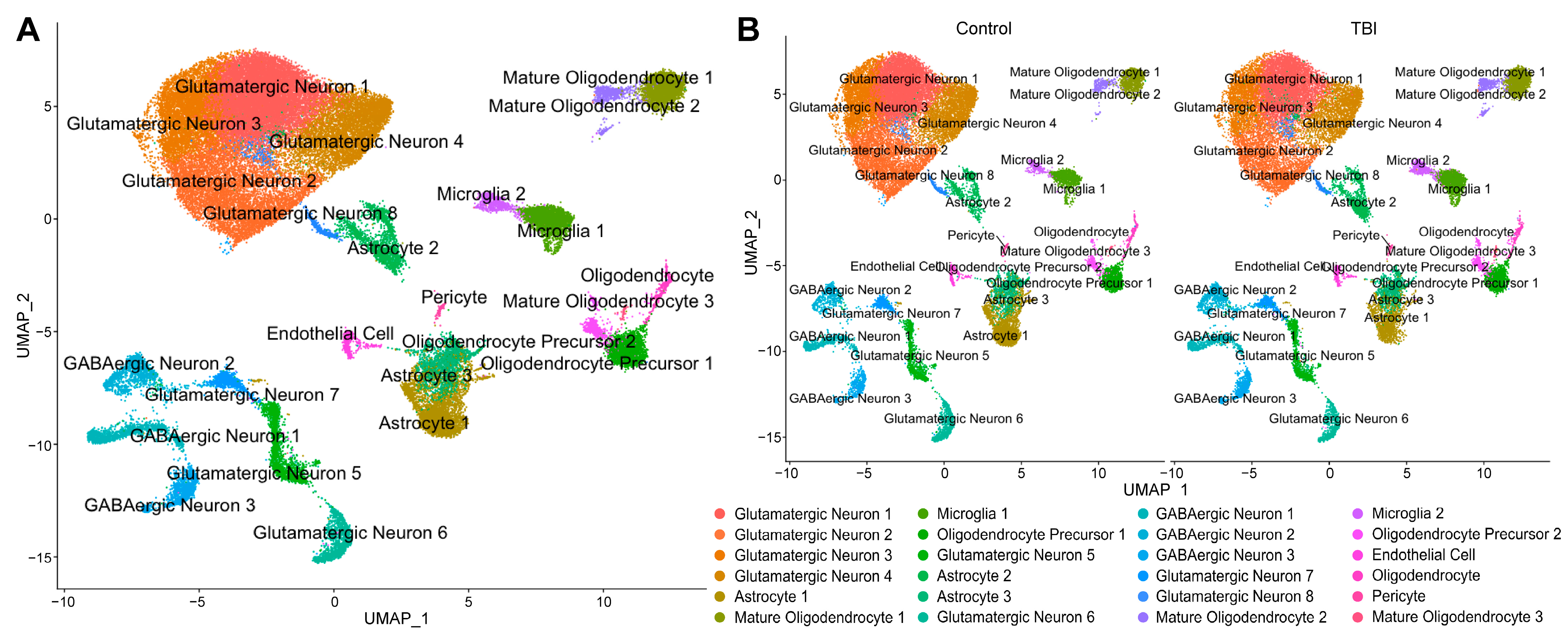 - Xing, J.; Ren, L.; Xu, H.; Zhao, L.; Wang, Z.H.; Hu, G.D.; Wei, Z.L. Single-Cell RNA Sequencing Reveals Cellular and Transcriptional Changes Associated With Traumatic Brain Injury. Front. Genet. 2022, 13, 861428. [Google Scholar] [CrossRef]