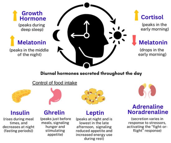 The regulation of CRs involves several key hormones, each playing distinct roles in maintaining the body’s internal clock. Above all, two CRs hormones are melatonin and cortisol (Figure 1 illustrates the hormones that have bidirectional effects on CRs). Traditionally, melatonin has been thought to be the superior CRs hormones that is also known as the “circadian rhythm hormone”. Melatonin is produced by the pineal gland, which receives information regarding the light–dark cycle from the surrounding environment []. Cortisol, the predominant glucocorticoid secreted by the adrenal gland, is referred to as the “activation hormone”. Cortisol helps regulate energy expenditure, metabolism, immune function, and alertness. It follows a circadian pattern, peaking in the early morning to increase alertness, and its decline promotes relaxation and sleep [,]. Melatonin and cortisol play complementary roles in regulating circadian rhythms. While both hormones are crucial for circadian rhythm regulation, in the current modern environmental influence, cortisol has a potentially superior role on CRs in terms of its broader impact on various physiological processes, together with its function in bodily response to stress and energy management. Melatonin, on the other hand, is more specifically focused on sleep regulation [,]. Besides these two hormones, growth hormone, insulin, leptin, ghrelin, adrenaline, and noradrenaline are also hormones influenced by circadian rhythm. These hormones collectively contribute to the synchronization of physiological processes with the 24 h day–night cycle, ensuring that various bodily functions occur at optimal times. Figure 1 illustrates the circadian changes in these hormones.