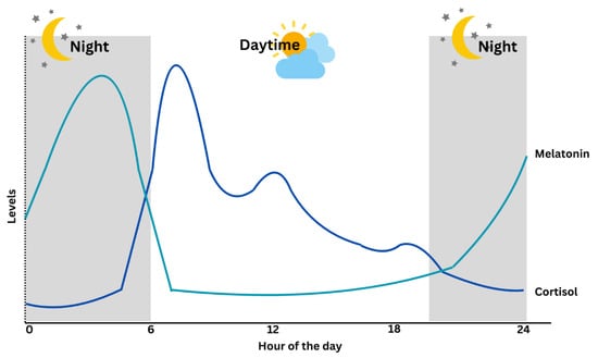Cortisol diurnal secretion, together with its ultradian oscillations that permit a rapid response to environmental threats, is controlled by the hypothalamic–pituitary–adrenal (HPA) axis. Cortisol regulations include predictable and unpredictable rhythms. The predictable, precise cortisol regulation is related to CRs, while the unpredictable rhythm involves superimposed pulsatile patterns that allow rapid responses to fine-tune physiological responses to changes in both the external and internal environment []. Circadian disruption or misalignment is characterized by the desynchronization between the central clock and human behavioural cycles involving 24 h sleep and wake, feeding and fasting, and activity and rest cycles []. Studying the CRs misalignment is complicated by various confounding factors, including external environmental or behavioural influences. Cortisol’s distinct secretory patterns, exhibiting both consistent diurnal rhythmicity and dynamic environmental influence, provide a comprehensive overview of the functioning of the human circadian system. Table 1 describes the comparison between cortisol and melatonin in circadian patterns, and Figure 2 illustrates the circadian circulation of both hormones.