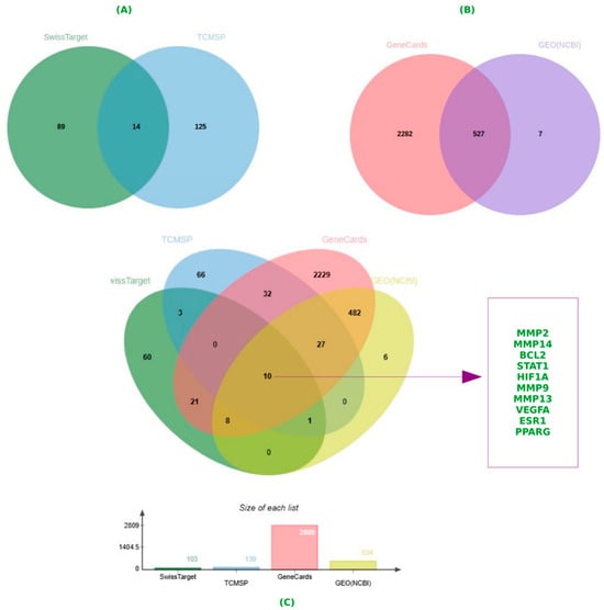 Visualization of intersecting target genes linked to EGCG and periodontitis using a Venn diagram. (A) Overlapping EGCG targets from SwissTarget and TCMSP. (B) Overlapping periodontitis targets from GeneCards and GEO (NCBI). (C) Integrated Venn analysis showing 10 common genes: MMP2, MMP14, BCL2, STAT1, HIF1A, MMP9, MMP13, VEGFA, ESR1 and PPARG. EGCG, epigallocatechin-3-gallate; TCMSP, the traditional Chinese medicine systems pharmacology database and analysis platform; GEO, Gene Expression Omnibus; gene symbols—MMP2, MMP14, BCL2, STAT1, HIF1A, MMP9, MMP13, VEGFA, ESR1 and PPARG.