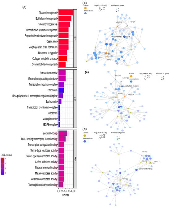 The GO enrichment analysis revealed that the target genes were associated with several critical biological functions. Within the BP category, they played key roles in processes such as tissue development (GO:0009888), epithelium development (GO:0060429), tube morphogenesis (GO:0035239), reproductive system development (GO:0061458), reproductive structure development (GO:0048608), ossification (GO:0001503), epithelium morphogenesis (GO:0002009), response to hypoxia (GO:0001666), collagen metabolic process (GO:0032963), and ovarian follicle development (GO:0001541). Additionally, Figure 2b presents a network visualization of BP-enriched terms, specifically highlighting response to hypoxia and its four key target genes: MMP2, MMP14, HIF1A, and VEGFA. Similarly, within the CC category, the target genes were found to be involved in essential structures such as the extracellular matrix (GO:0031012), external encapsulating structure (GO:0030312), transcription regulator complex (GO:0005667), chromatin (GO:0000785), RNA polymerase II transcription regulator complex (GO:0090575), euchromatin (GO:0000791), transcription preinitiation complex (GO:0097550), pinosome (GO:0044352), macropinosome (GO:0044354), and ISGF3 complex (GO:0070721) (Figure 2a). The network of CC-enriched terms, specifically the extracellular matrix and its five key target genes—MMP2, MMP9, MMP13, MMP14, and VEGFA—is illustrated in Figure 2c. In the MF category, the target genes were involved in crucial molecular functions, including zinc ion binding (GO:0008270), DNA-binding transcription factor binding (GO:0140297), transcription coregulator binding (GO:0001221), serine-type peptidase activity (GO:0008236), serine-type endopeptidase activity (GO:0004252), serine hydrolase activity (GO:0017171), nuclear receptor binding (GO:0016922), metallopeptidase activity (GO:0008237), metalloendopeptidase activity (GO:0004222), and transcription coactivator binding (GO:0001223) (Figure 2a). Furthermore, Figure 2d visualizes the network of MF-enriched terms, particularly zinc ion binding, along with its six key target genes: MMP2, MMP9, MMP13, MMP14, PPARG, and ESR1.