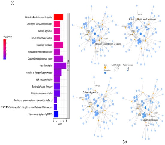 The REACTOME pathway analysis was conducted to investigate the functional roles and signaling mechanisms of the identified periodontitis-related targets of EGCG. A total of 139 significant pathways associated with periodontitis and EGCG were identified. Among these, the top 15 pathways with the highest gene counts were visualized in a bar plot (Figure 3a). The findings suggest that EGCG exerts its therapeutic effects on periodontitis through multiple targets and diverse signaling pathways. Furthermore, a network representation of key enriched pathways, including Interleukin-4 and Interleukin-13 signaling, Matrix Metalloproteinase activity, Collagen degradation, and Interleukin signaling, along with their essential target genes, is illustrated in Figure 3b.