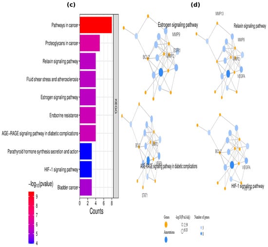 Results of REACTOME and KEGG pathway enrichment analysis and construction of the key pathway–target network. (a) Bar chart displaying the top 15 significantly enriched pathways based on REACTOME analysis. (b) Representative networks highlighting four key pathway terms from REACTOME, and their associated target genes. (c) Bar chart displaying the top 10 significantly enriched pathways based on KEGG analysis. (d) Representative networks highlighting four key pathway terms from KEGG, and their associated target genes. Color gradients represent varying p value thresholds, while bar lengths indicate the number of genes mapped to each pathway. Gene symbols—MMP2, MMP14, BCL2, STAT1, HIF1A, MMP9, MMP13, VEGFA, ESR1 and PPARG.