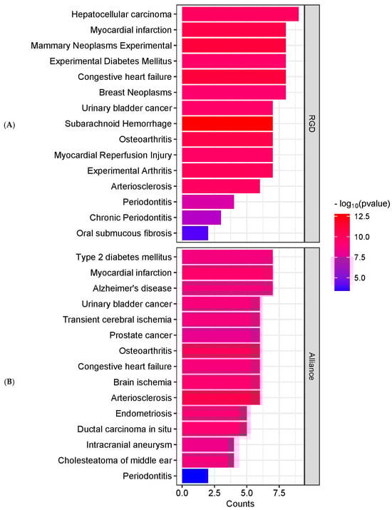 Results of disease enrichment analysis. (A) Bar chart showing the top 15 significantly enriched disease terms derived from the RGD disease database. (B) Bar chart showing the top 15 significantly enriched disease terms identified from the Alliance disease database. Color gradients indicate different p value thresholds, and bar lengths represent the number of genes associated with each disease term.