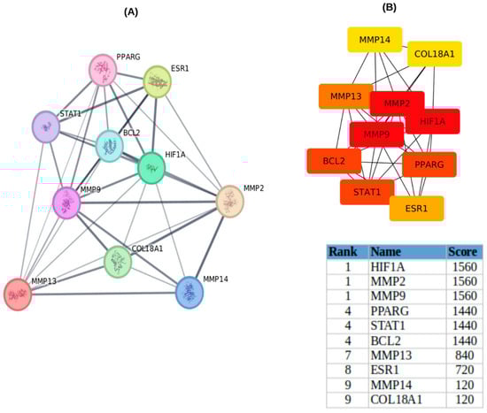 Protein–protein interaction (PPI) network and Cytoscape visualization of shared target genes between EGCG and periodontitis. (A) Protein–protein interaction (PPI) network constructed using the STRING database, based on the shared gene targets of EGCG and periodontitis. (B) Cytoscape analysis illustrating key target genes within the PPI network. Node color intensity follows an orange gradient representing degree centrality: darker shades indicate nodes with higher scores (i.e., greater connectivity to other nodes), whereas lighter shades represent nodes with lower connectivity. Gene symbols—MMP2, MMP14, BCL2, STAT1, HIF1A, MMP9, MMP13, COL18A1, ESR1 and PPARG.