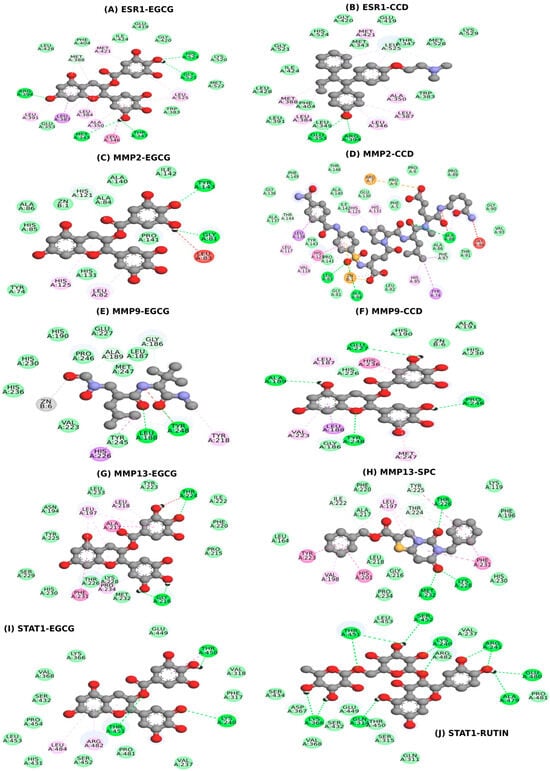 Molecular docking visualization of EGCG and reference compounds with key hub proteins involved in periodontitis. The docking complexes include: (A) ESR1–EGCG, (B) ESR1–CCD, (C) MMP2–EGCG, (D) MMP2–CCD, (E) MMP9–EGCG, (F) MMP9–CCD, (G) MMP13–EGCG, (H) MMP13–SPC, (I) STAT1–EGCG, and (J) STAT1–Rutin. The diagrams display ligand–protein interactions, highlighting the binding orientations within the active sites of each target. Gene symbols—ESR1, MMP2; MMP9; MMP13 and STAT1; EGCG, epigallocatechin gallate; CCD, co-crystal ligand; SPC, co-crystal ligand.