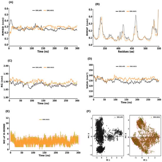 The RMSD analysis demonstrated that both the ESR1–APO and ESR1–EGCG systems reached equilibrium within 200 ns and remained stable throughout the 300 ns simulation (Figure 7). The average RMSD values for ESR1–APO and ESR1–EGCG were 0.27 ± 0.03 nm and 0.28 ± 0.03 nm, respectively, suggesting minimal deviations during the simulation (Figure 7A). The RMSF analysis of the protein residues showed average values for ESR1–APO and ESR1–EGCG of 0.15 ± 0.12 nm and 0.13 ± 0.14 nm, respectively, indicating no significant change in the flexibility of the complexes with ligand binding (Figure 7B). The calculated Rg values were 1.88 ± 0.01 nm for ESR1–APO and 1.90 ± 0.01 nm for ESR1–EGCG, indicating negligible effects of EGCG binding on the protein’s compactness (Figure 7C). SASA values were 129.45 ± 3.66 nm2 for ESR1–APO and 133.32 ± 2.91 nm2 for ESR1–EGCG, suggesting a slight increase in solvent accessibility upon ligand binding (Figure 7D). Hydrogen bond formation between ESR1 and EGCG was consistent throughout the simulation, maintained by the average rate of 1 to 4 hydrogen bonds with the ESR1–EGCG complex. (Figure 7E). PCA of ESR1–APO and ESR1–EGCG showed average co-variance values of 26.63 nm and 26.77 nm, respectively (Figure 7F).