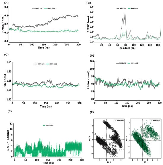 RMSD analysis indicated that both MMP2–APO and MMP2–EGCG reached equilibrium within 200 ns and exhibited stability throughout the simulation (Figure 8A). The average RMSD values for MMP2–APO and MMP2–EGCG were 0.22 ± 0.05 nm and 0.12 ± 0.01 nm, respectively. The RMSF values for MMP2–APO and MMP2–EGCG were 0.11 ± 0.10 nm and 0.07 ± 0.04 nm, respectively, showing no significant change in flexibility due to ligand binding (Figure 8B). Rg values were 1.53 ± 0.01 nm for MMP2–APO and 1.52 ± 0.01 nm for MMP2–EGCG, with negligible effect on the protein’s compactness (Figure 8C). SASA values were 90.43 ± 2.01 nm2 for MMP2–APO and 89.96 ± 1.93 nm2 for MMP2–EGCG, indicating a slight change in solvent accessibility (Figure 8D). Hydrogen bonds formed between MMP2 and EGCG were consistent, maintained by the average rate of 1 to 2 hydrogen bonds with the MMP2–EGCG complex (Figure 8E). PCA for MMP2–APO and MMP2–EGCG showed average co-variance values of 10.60 nm and 2.73 nm, respectively (Figure 8F).