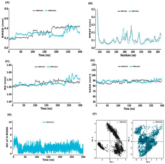 Molecular dynamics (MD) simulation analysis of MMP9 and its interaction with EGCG. (A) RMSD plot comparing the MMP9 apo form and MMP9–EGCG complex. (B) RMSF plot showing the residue-wise flexibility for MMP9 apo and MMP9–EGCG complex. (C) Rg distribution plot comparing the compactness of MMP9 in its apo form and the MMP9–EGCG complex. (D) SASA plot comparing the solvent-accessible surface area of MMP9 apo and MMP9–EGCG complex. (E) Time evolution of intermolecular hydrogen bonds formed in the MMP9–EGCG complex. (F) PCA plot illustrating the conformational dynamics of MMP9 in its apo form and in complex with EGCG.