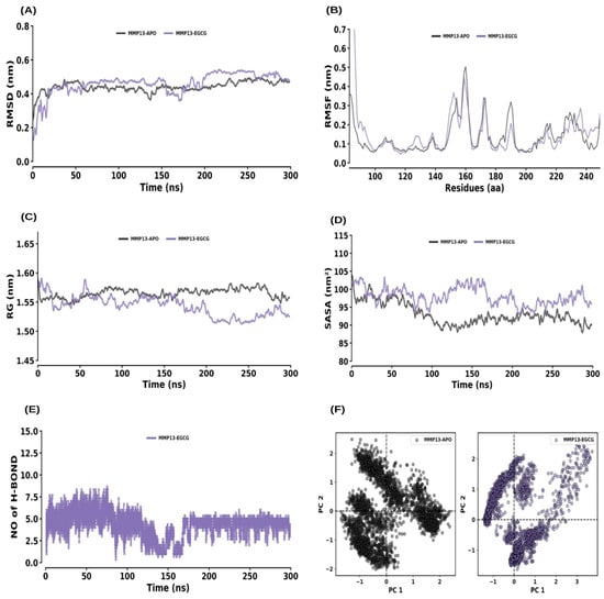 For MMP13–APO and MMP13–EGCG, the RMSD analysis revealed equilibrium within 200 ns, with both systems maintaining stability through 300 ns (Figure 10A). The average RMSD values for MMP13–APO and MMP13–EGCG were 0.44 ± 0.03 nm and 0.46 ± 0.07 nm, respectively. RMSF values for MMP13–APO and MMP13–EGCG were 0.14 ± 0.09 nm and 0.16 ± 0.17 nm, respectively (Figure 10B). The Rg values were 1.57 ± 0.01 nm for MMP13–APO and 1.54 ± 0.02 nm for MMP13–EGCG, indicating negligible changes in compactness (Figure 10C). SASA values were 93.05 ± 3.32 nm2 for MMP13–APO and 98.05 ± 2.79 nm2 for MMP13–EGCG, reflecting a slight increase in solvent accessibility (Figure 10D). Consistent hydrogen bond formation was observed throughout the simulation and maintained by the average rate of 1 to 5 hydrogen bonds with the MMP13–EGCG complex (Figure 10E). PCA showed average co-variance values of 12.84 nm and 14.02 nm for MMP13–APO and MMP13–EGCG, respectively (Figure 10F).