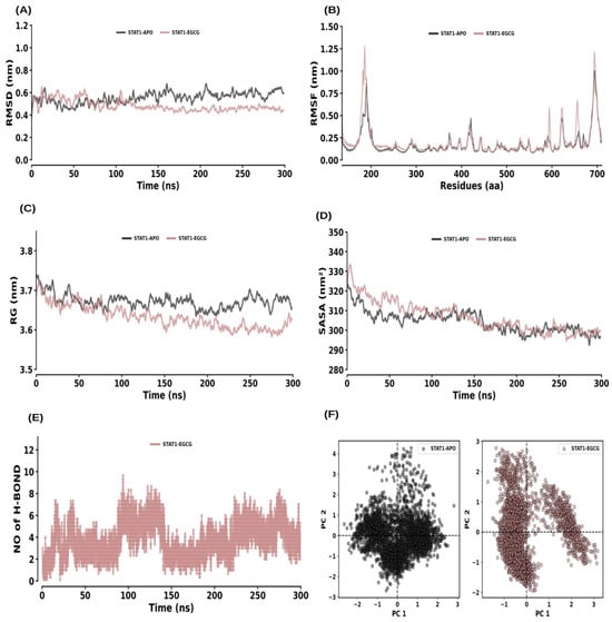 RMSD analysis showed that both STAT1–APO and STAT1–EGCG reached equilibrium within 200 ns and remained stable throughout the 300 ns simulation (Figure 11A). The average RMSD values for STAT1–APO and STAT1–EGCG were 0.55 ± 0.06 nm and 0.48 ± 0.06 nm, respectively. The RMSF analysis for STAT1–APO and STAT1–EGCG showed average values of 0.18 ± 0.13 nm and 0.21 ± 0.18 nm, respectively (Figure 11B). The Rg values were 3.67 ± 0.02 nm for STAT1–APO and 3.63 ± 0.03 nm for STAT1–EGCG, indicating no significant change in compactness (Figure 11C). SASA values were 304.35 ± 5.97 nm2 for STAT1–APO and 306.82 ± 8.18 nm2 for STAT1–EGCG, showing a slight increase in solvent accessibility (Figure 11D). Hydrogen bonds were consistently formed throughout the simulation and maintained by the average rate of 1 to 3 hydrogen bonds with the STAT1–EGCG complex (Figure 11E). The PCA showed average co-variance values of 83.65 nm and 125.44 nm for STAT1–APO and STAT1–EGCG, respectively (Figure 11F).