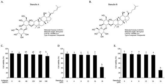 Effects of AP, DA, and DB on viability of RAW264.7 cells. (A) Chemical formular of DA. (B) Chemical formular of DB. The cells (2.5 × 105 cells/well) were cultured in 48-well plates and treated with AP, DA, and DB at the indicated concentrations for 24 h. Thereafter, cell viability of (C) AP, (D) DA, and (E) DB was analyzed using the CCK-8 as-say and graphed as a percentage. Data are presented as the mean ± SEM of three independent experiments. a–b Mean values designated by different superscript letters were significantly different between groups at p < 0.05, as determined by Duncan’s multiple-range test.