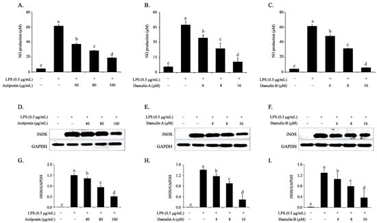 Effects of AP, DA, and DB on NO production and iNOS expression in LPS-stimulated RAW264.7 cells. The cells (2.5 × 105 cells/well in 48-well plate for NO assay, 2 × 106 cells/100 mm dishes for Western blot) are cultured and treated with AP, DA, and DB for 4 h, then incubated with LPS (500 ng/mL) for another 20 h. Nitrite accumulated in the culture medium is analyzed using Griess reagent, and calibration curve is based on NaNO3; (A) AP, (B) DA, and (C) DB. Protein expression of iNOS is determined using Western blot analysis; (D) AP, (E) DA, (F) DB. (G–I) Quantitative data of (D–F) are analyzed using ImageJ bundle with Java 1.8.0_172 software. GAPDH served as an internal control. The data are presented as the mean ± SEM of three independent experiments. a–e Mean values designated by different superscript letters are significantly different between groups at p < 0.05 as determined by Duncan’s multiple-range test.